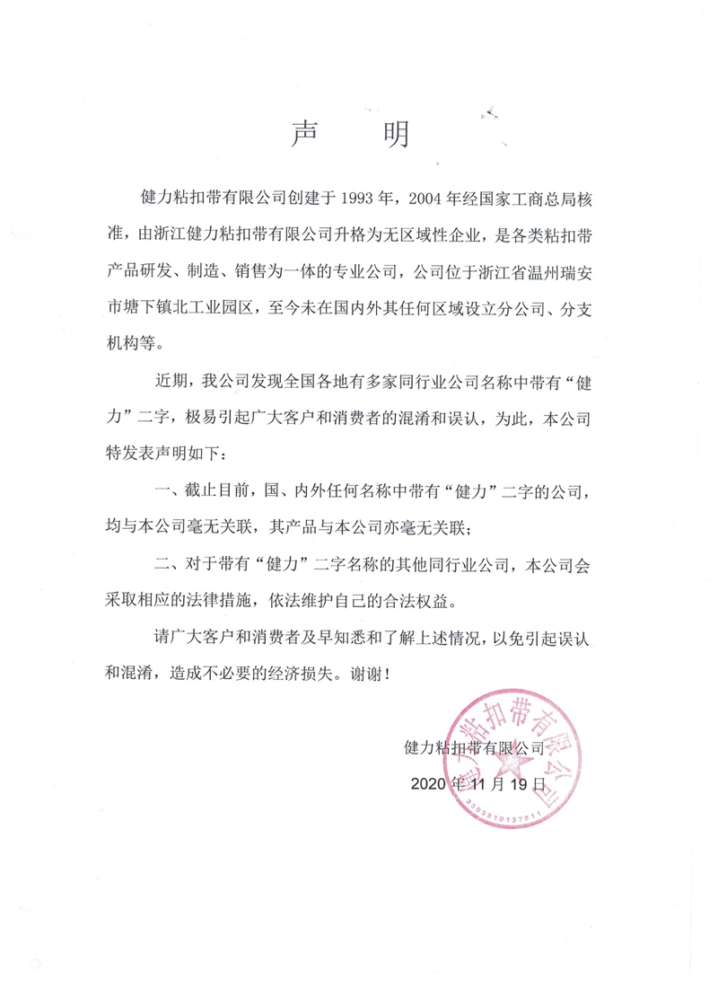 近期,我公司發(fā)現(xiàn)全國各地有多家同行業(yè)公司名稱中帶有“健力”二字,極易引起廣大客戶和消費者的混淆和誤認,為此,本公司特發(fā)表聲明如下: